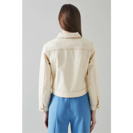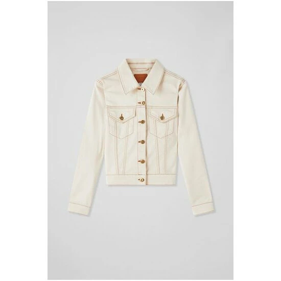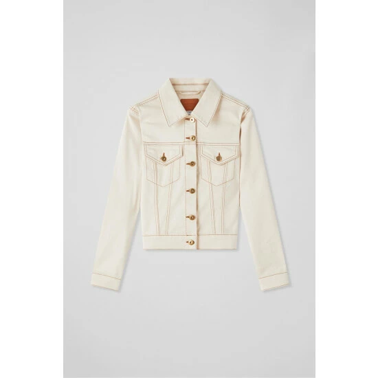The Cora denim jacket is crafted from supersoft cream cotton denim. It has a neat collar, gold buttons, patch chest pockets with buttons, contrast stitching, buttoned cuffs and a cropped length.