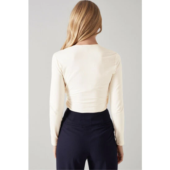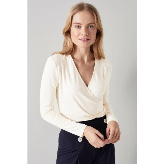 The Eames top is crafted in Portugal from ivory jersey. It has a wrapover, V-front with side ruching detail, a slim fit with great stretch and long sleeves.