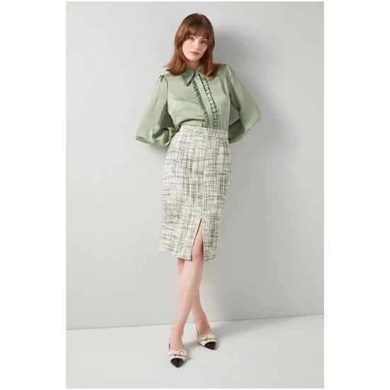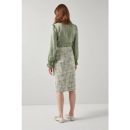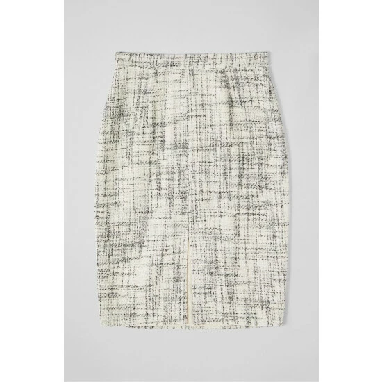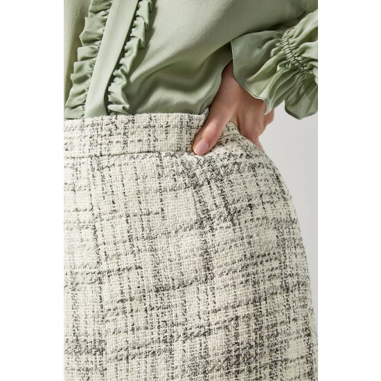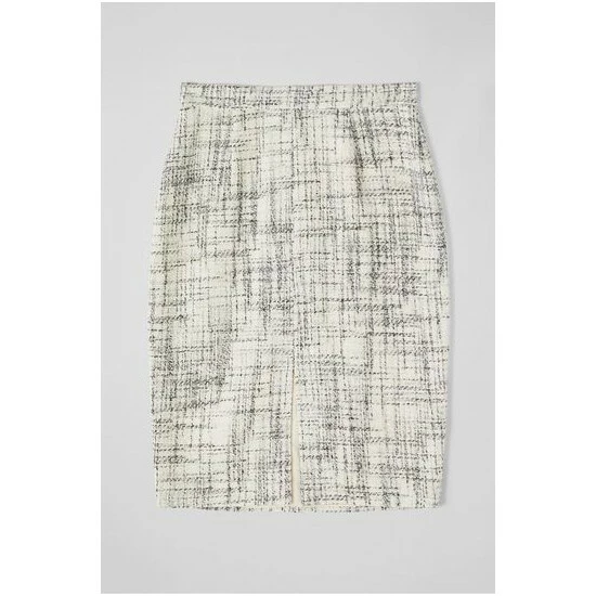 The Lottie skirt is crafted from beautiful cream tweed with flecks of dark grey. It sits on the waist, has a sleek silhouette, falls to just above the knee and is finished with a centre front slit.