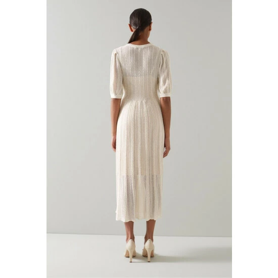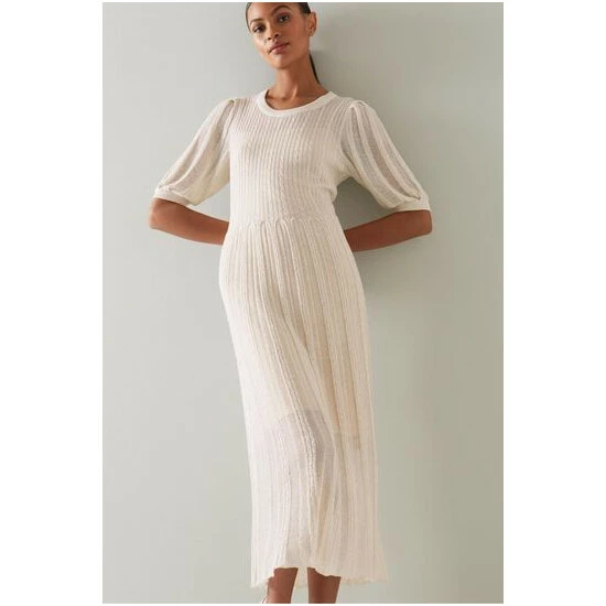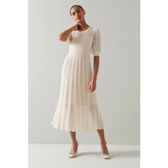 The Ivy knitted dress is crafted from a cream metallic thread knit with a ribbed and cable texture. It has a round neck, pleated voluminous elbow-length sleeves, a fitted silhouette and a swingy midi length skirt.