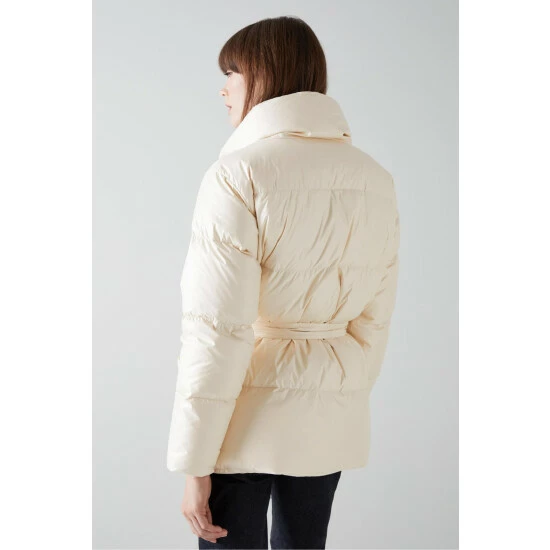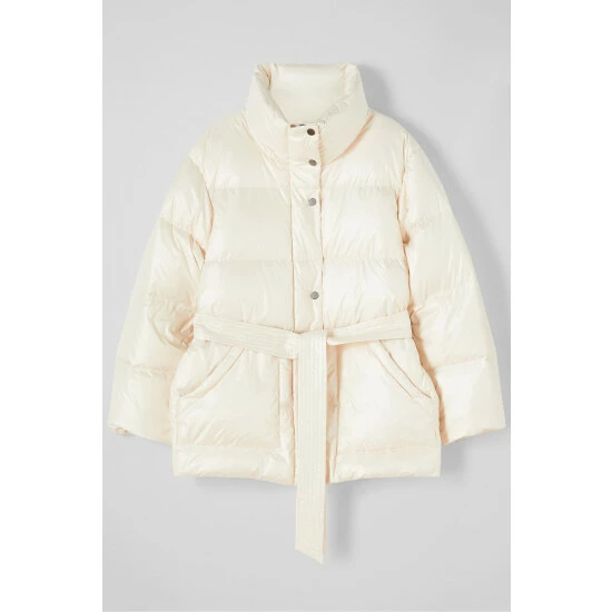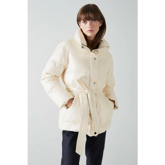 The Morzine puffer jacket is crafted from silky cream fabric and filled with recycled down. It’s a short style with a funnel neck, zip and button fastenings, side pockets and a tie belt.