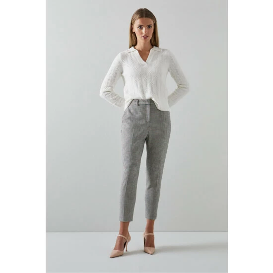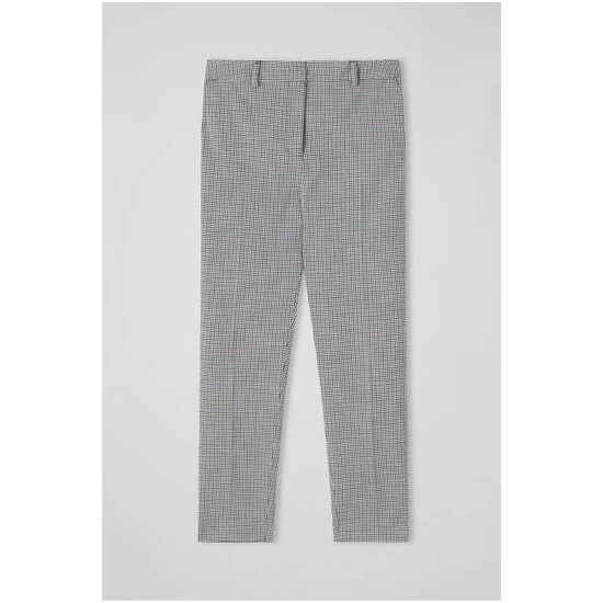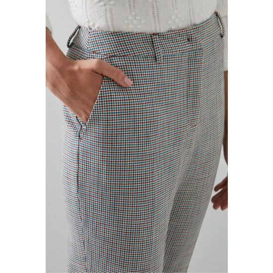 The Nina tailored trousers are crafted in Europe from an Italian LENZING™ ECOVERO™ *fabric in a teal and red houndstooth check. They sit on the waist with belt loops, and have side pockets and a slim, tapered shape.