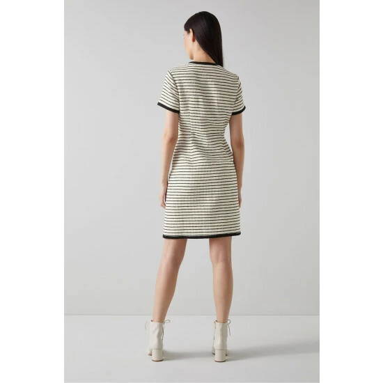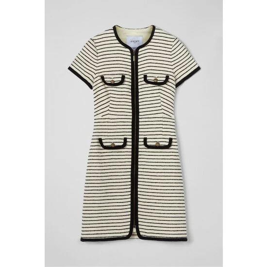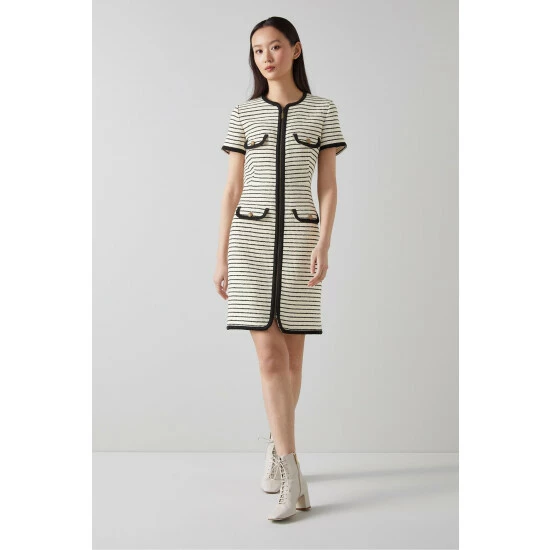 The Priya dress is crafted from tweed in cream and black skinny stripes. It’s a round neck style with a zip fastening, four faux pockets to the front with gold crest buttons and it’s finished with a contrast trim.