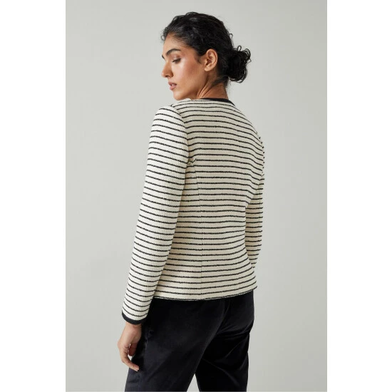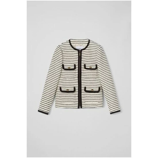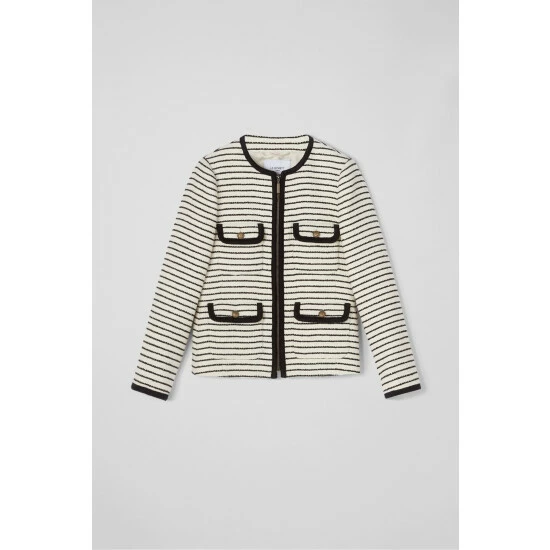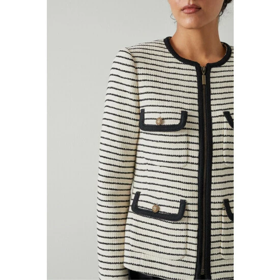 The Priya jacket is crafted from tweed in cream and black skinny stripes. It’s a round neck style with a zip fastening, four pockets to the front with gold crest buttons and is finished with a contrast trim.