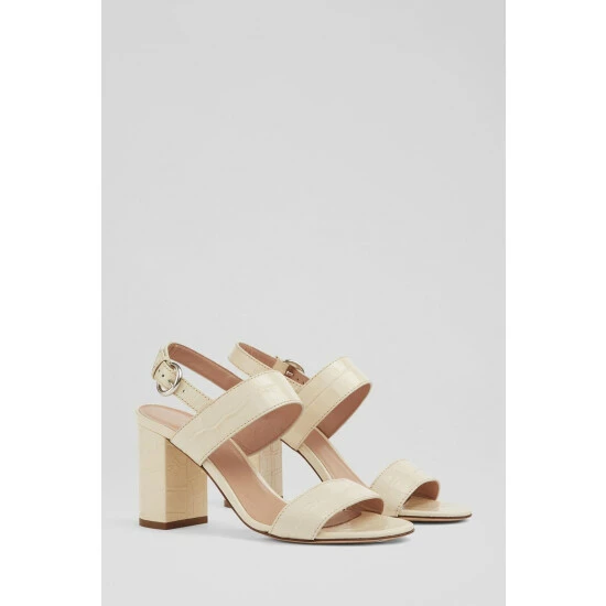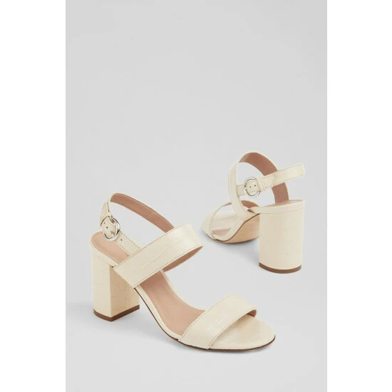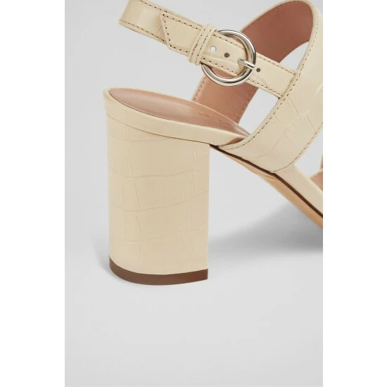 The Raya sandals are crafted in Italy from cream croc-effect leather. They have a wide strap over the toes, one over the foot, a back strap with a round buckle and an 80mm block heel.