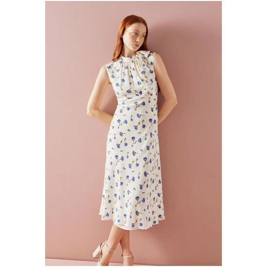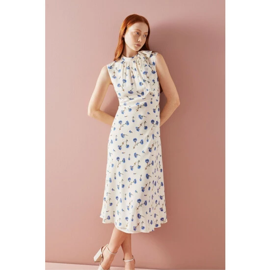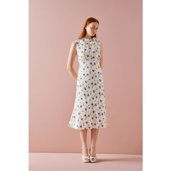 The Vali dress is crafted from cream silk with a vintage archive hand painted cornflower print in blue. It is a sleeveless style with a high neck and tie detail and a floaty fit falling to a midi-length skirt.