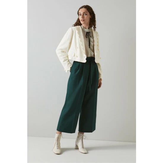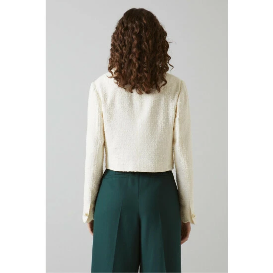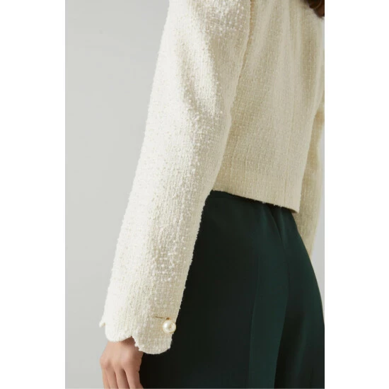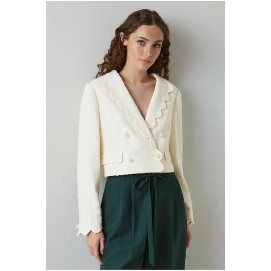 The Venice jacket is crafted in Europe from Italian cream tweed. It has a cropped shape, an open collar with a playful scallop edge, flapover pocket detail and pretty pearl buttons.