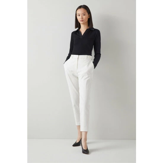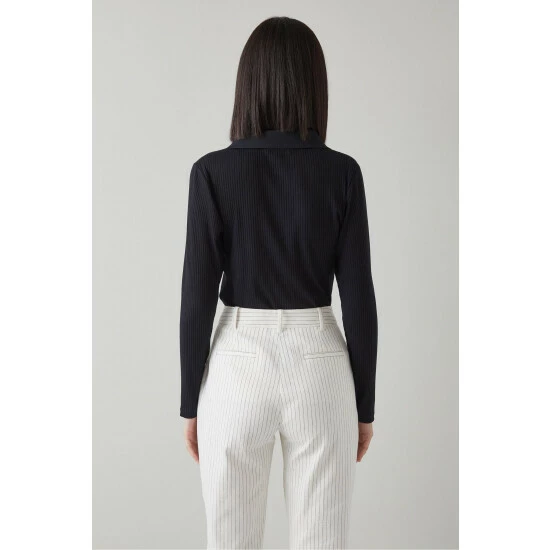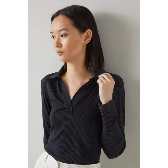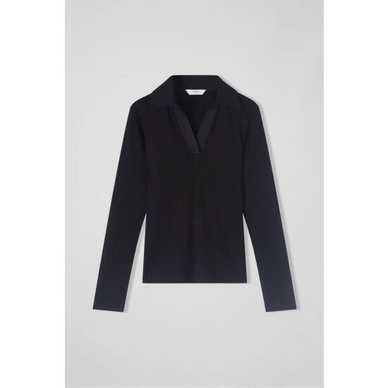 The Diana top is crafted from ribbed jersey in black. It has an open collar, long sleeves and a regular fit.