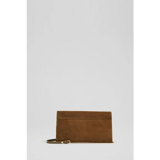 The Dora clutch is crafted in Spain from olive green suede. It’s a roomy, envelope style with a handy inside pocket, a detachable chain shoulder strap and a metal button closure.