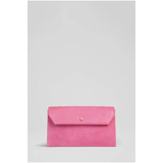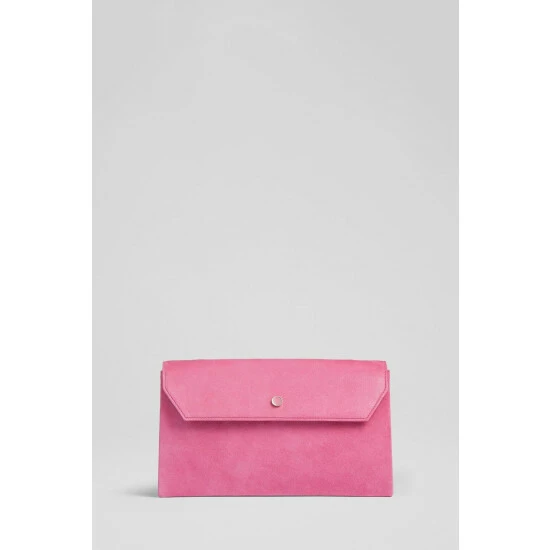 The Dora clutch is crafted in Spain from sweetpea pink suede. It’s a roomy, envelope style with a handy inside pocket, a detachable chain shoulder strap and a metal button closure.