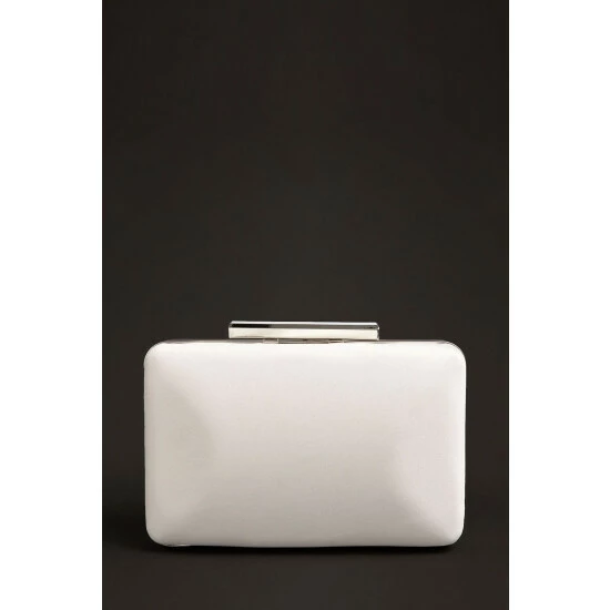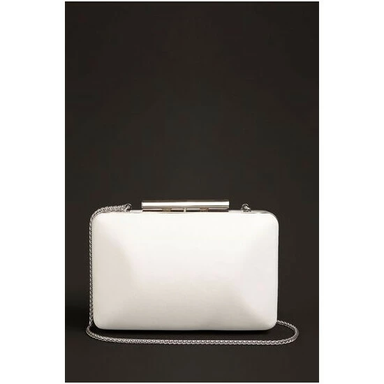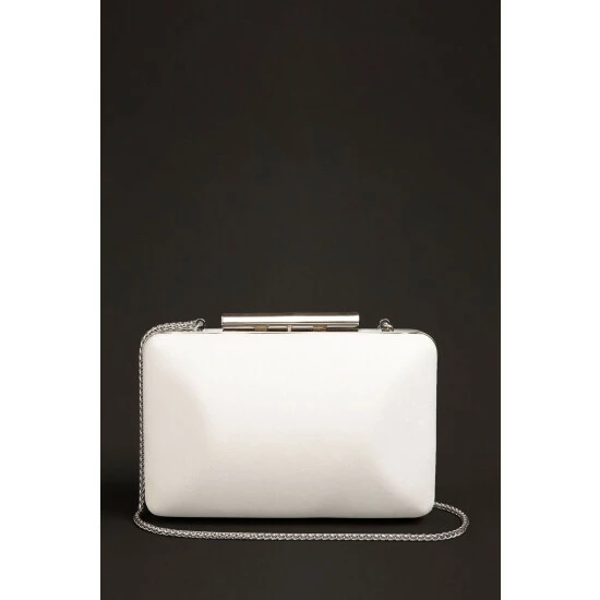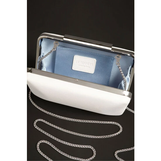 The Dotty wedding clutch bag is crafted in Spain from luxurious satin in classic ivory. It has a tapered, 3D rectangular shape, a chain shoulder strap and inside slip pocket.