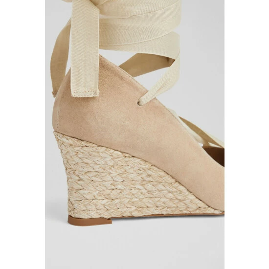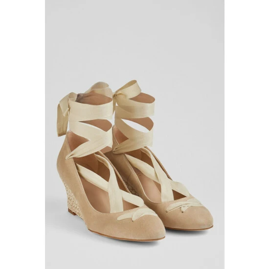 The Drina wedges are crafted in Spain from beige suede. They have a round toe, crossover strap detail across the foot and around the ankles in cream, a sleek shape and an espadrille wedge heel.