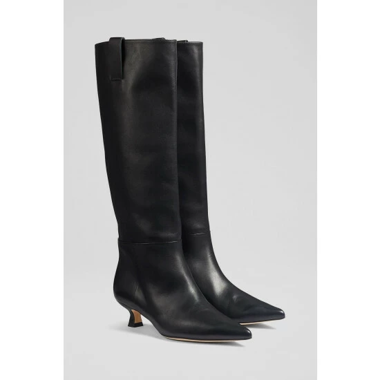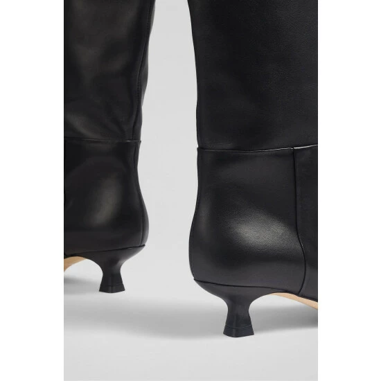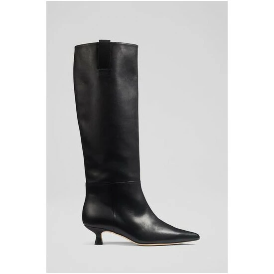 The Eden western style knee-high boots are crafted in Spain from black calf leather. They have a pointed toe, a long, wide cut with pull-on side tabs and 45mm kitten heels.