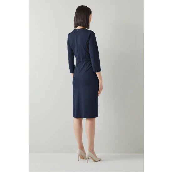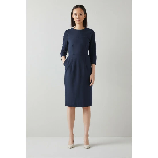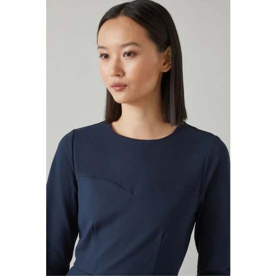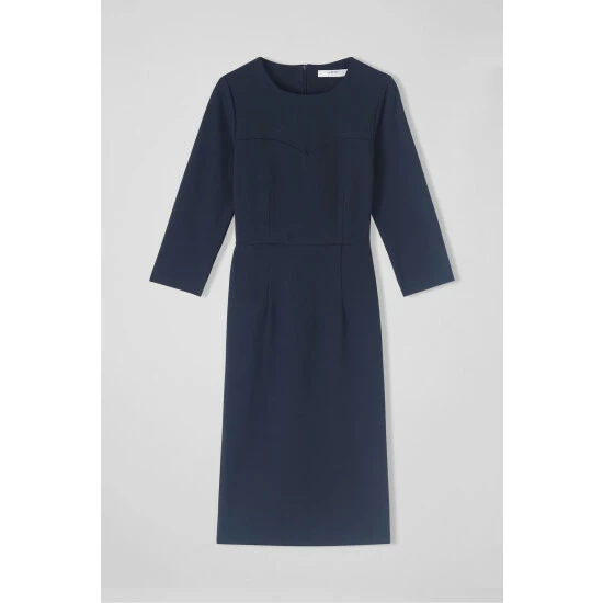 The Elia shift dress is crafted in Portugal from navy blue jersey. It has a round neck, three-quarter length sleeves, a fitted shape and a knee-length pencil skirt.