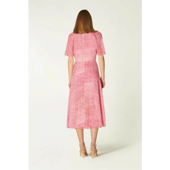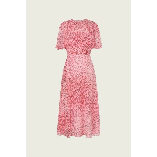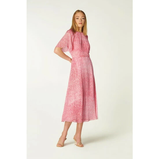 The Elowen dress is crafted from a silky fabric in a soft pink animal print. It has a round neck with pleat detail to the front, short cape sleeves and a floaty midi skirt.