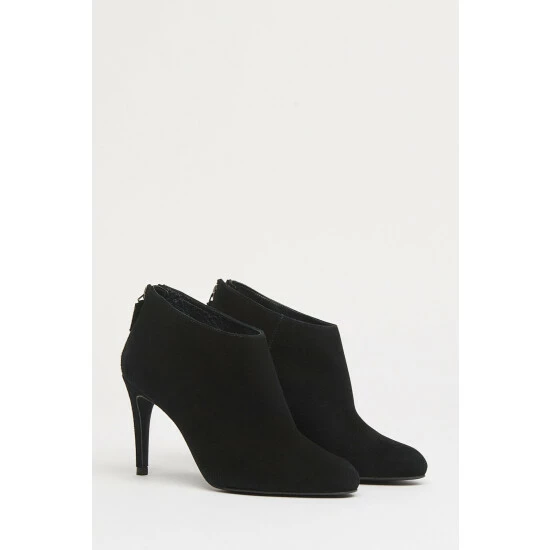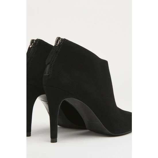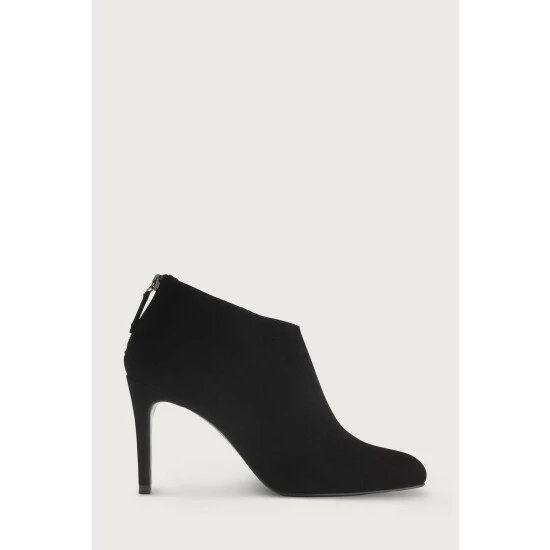 Crafted in Spain from super-soft black suede, they have a round toe, a low cut to expose the ankle, a back zip and an elegant stiletto heel.