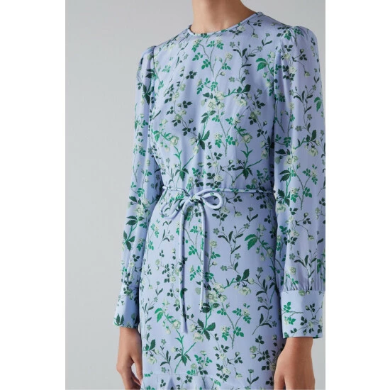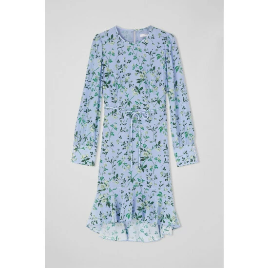 The Emylou dress is crafted from blue silk with an 18th century apple blossom print in green. It has a round neck, long sleeves, a skinny tie belt and a frill-edge skirt with a dipped hem.