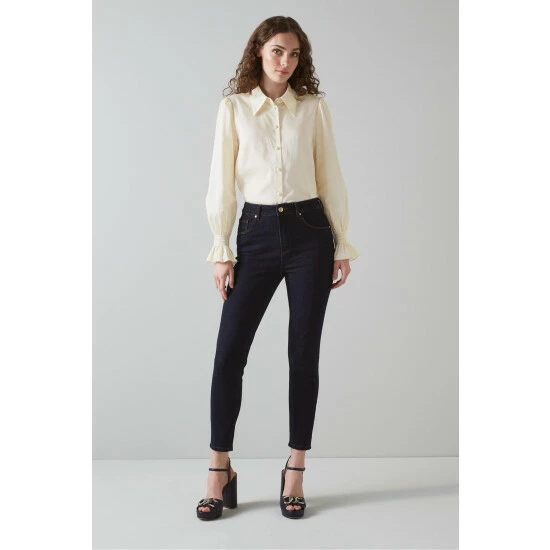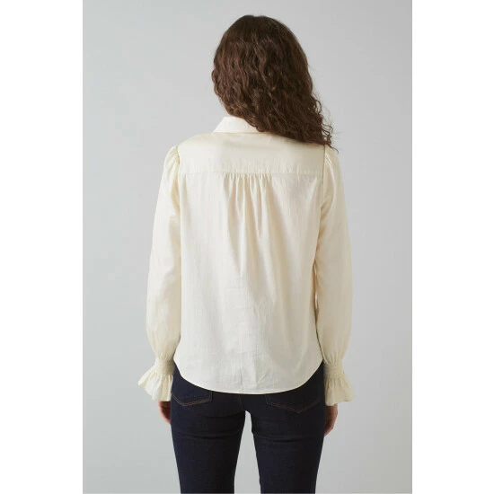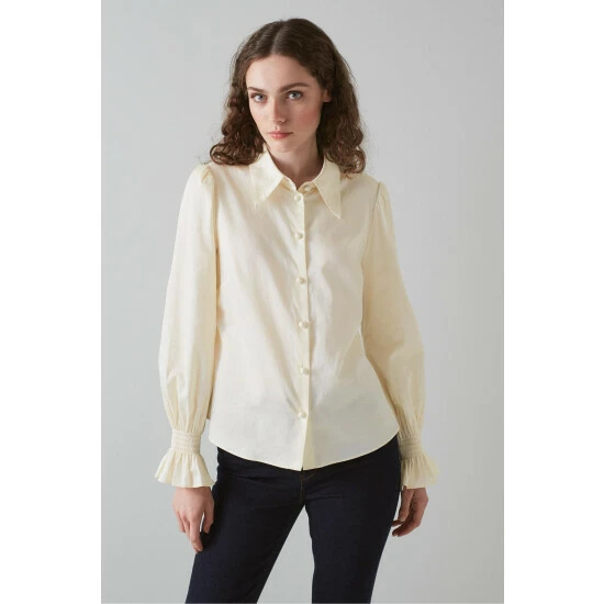 The Etten blouse is crafted from a cotton in turtledove cream. It has pointed collars, fabric-covered buttons, pleat detail to the back and long sleeves finished with a stylish shirred, ruffled cuff.