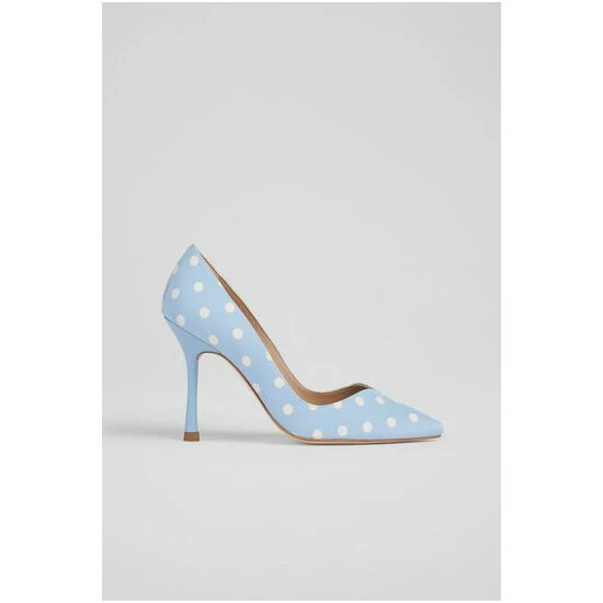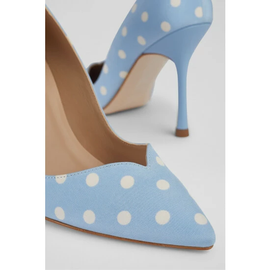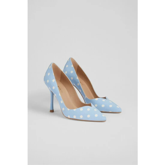 The Faye courts are crafted in Spain from light blue and cream polka dot silk. They have a pointed toe, a sweetheart topline, a sleek shape and a shapely 10cm stiletto heel.