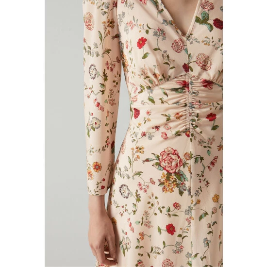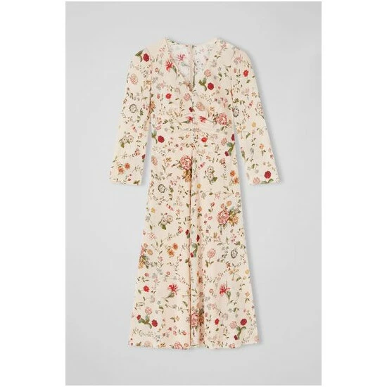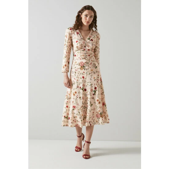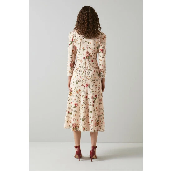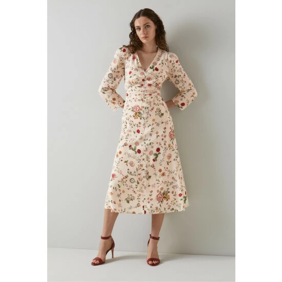 The Gabrielle midi dress is crafted from stretch silk in a vintage archive camelia print in fresh cream, red, pink and green. It has a V-neck with ruching detail, built-in shoulder pads with gentle puff shoulders, bracelet-length sleeves and a midi length skirt.
