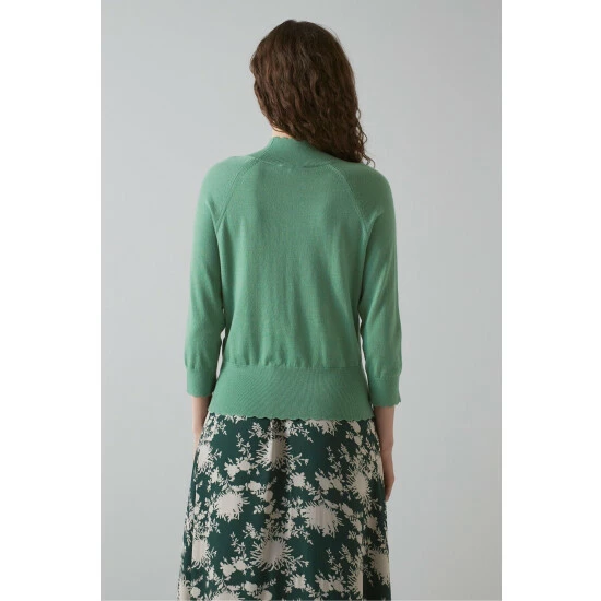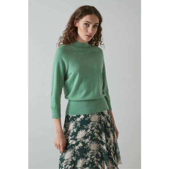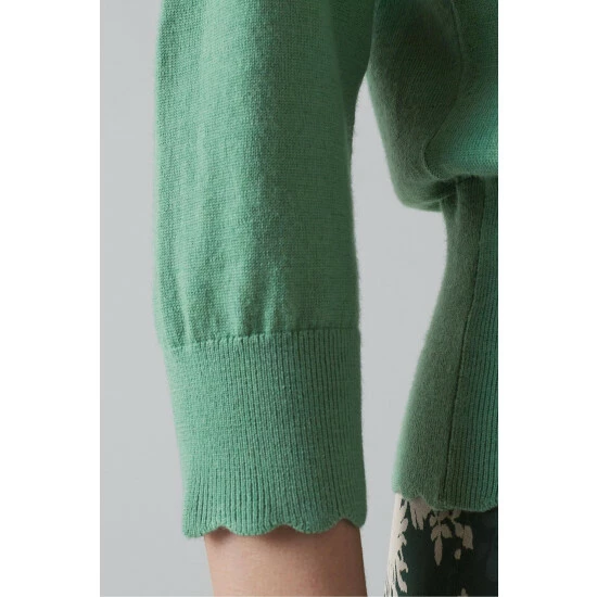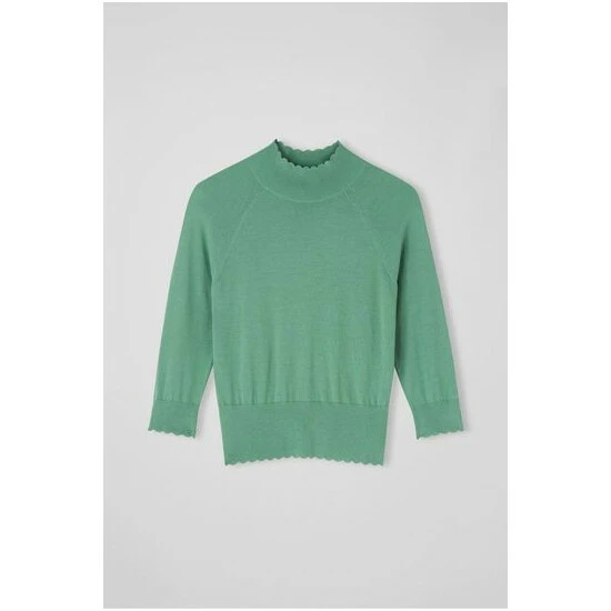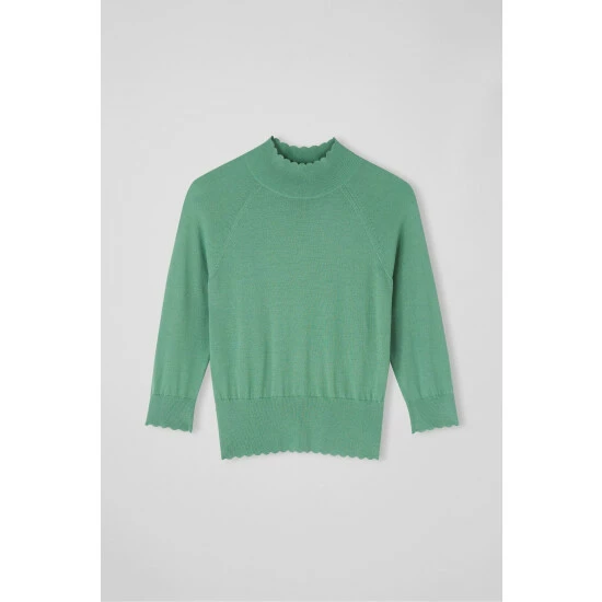 The Betty jumper is crafted from extra-fine merino wool in frosted spruce sage green. It has a turtle neck with a scallop edge, three-quarter sleeves with matching cuffs, a regular fit and a scalloped hemline.