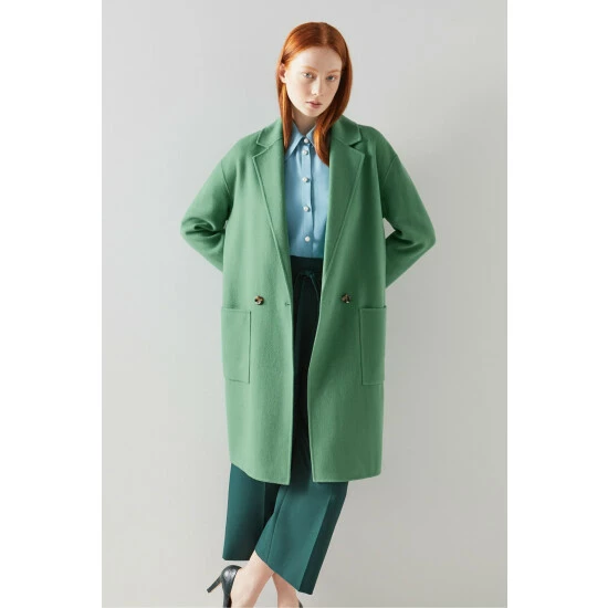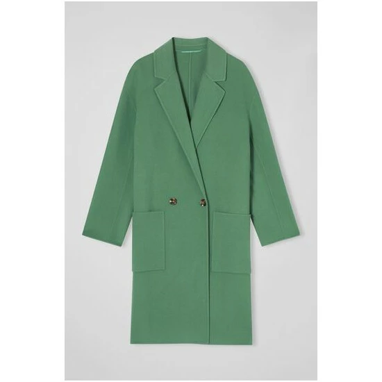 The Eden coat is crafted from double-faced wool in green frosted spruce. It has rounded, dropped shoulders, a cocoon shape, a notch lapel, double-breasted buttons and large patch pockets to the front.