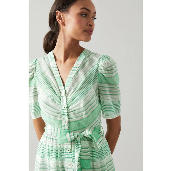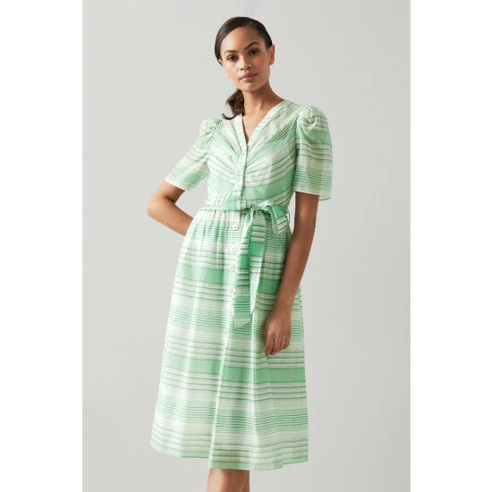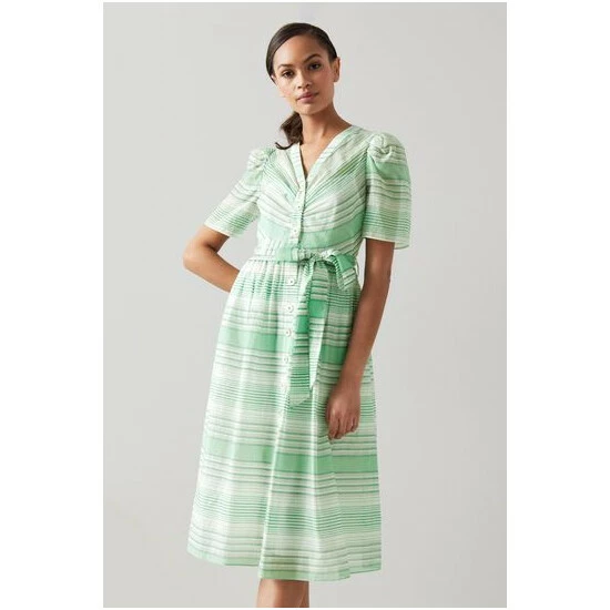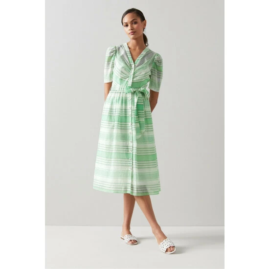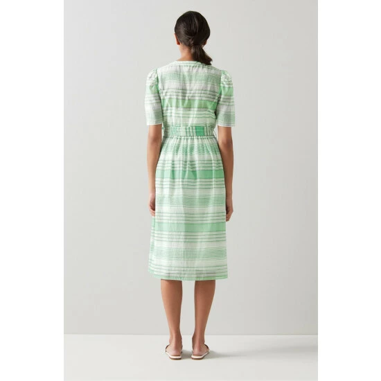 The Hendrick shirt dress is crafted from a cotton-silk fabric in green and white stripes. It’s a ruched V-neck, collarless style with puff shoulders, short sleeves, white buttons, a tie belt and a midi-length skirt.