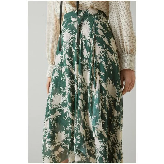 The Krasner skirt is crafted from a sheer georgette in a vintage archive chrysanthemum print in dark green and cream. It is lined, sits on the waist and floats to a midi length with a ruffle trim and a dipped hem.
