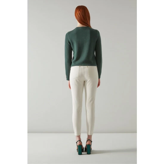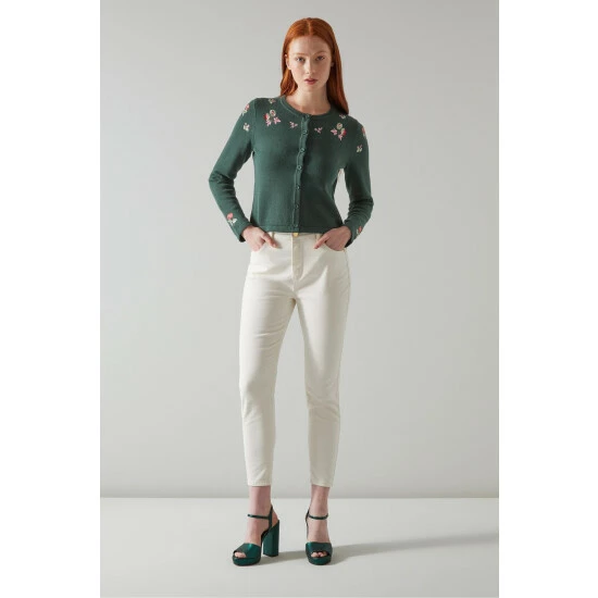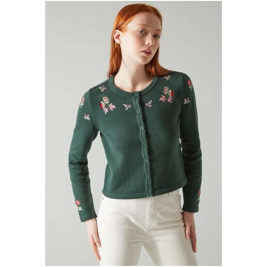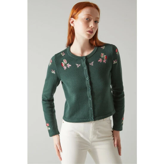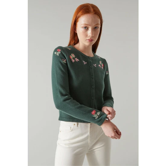 The Monty cardigan is crafted from a cotton-wool blend in pine grove green. It’s a round-neck style with red and pink floral embroidery, long sleeves, green buttons and a classic fit.
