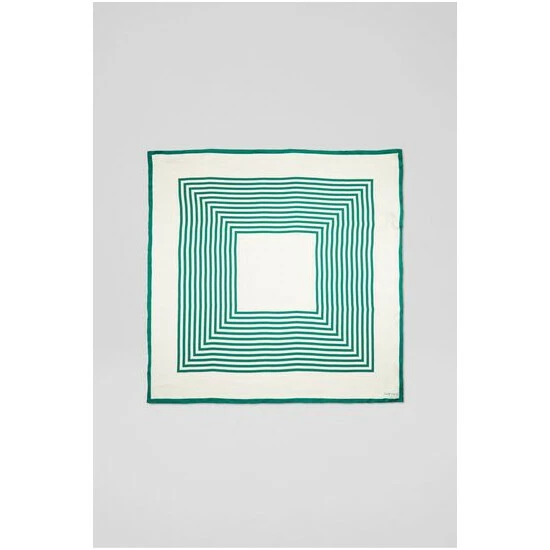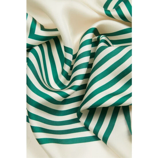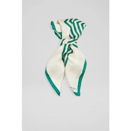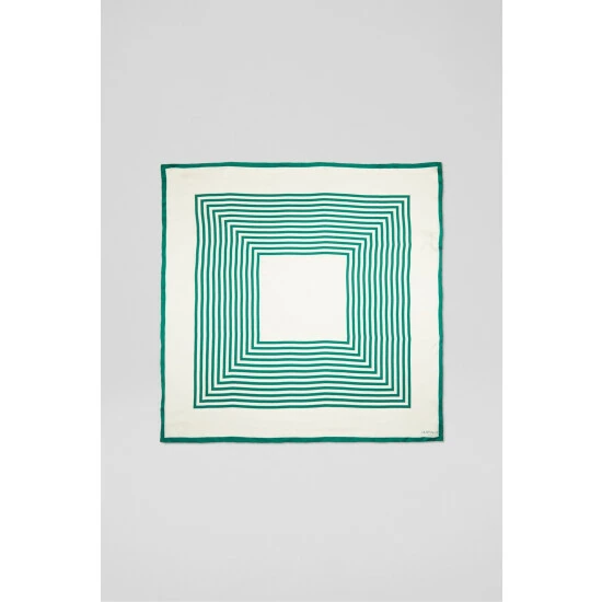 The Nicole scarf is crafted from silk in cream and green. It’s a classic square style with a frame print.