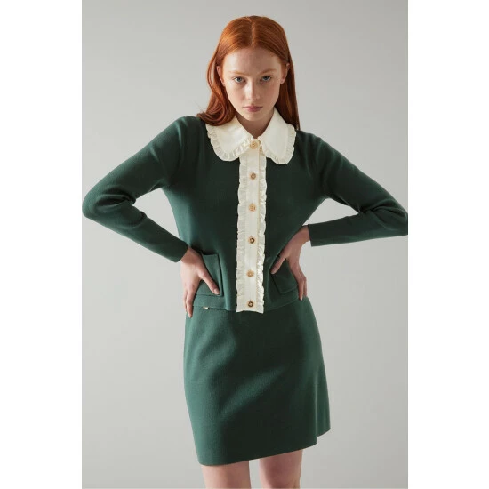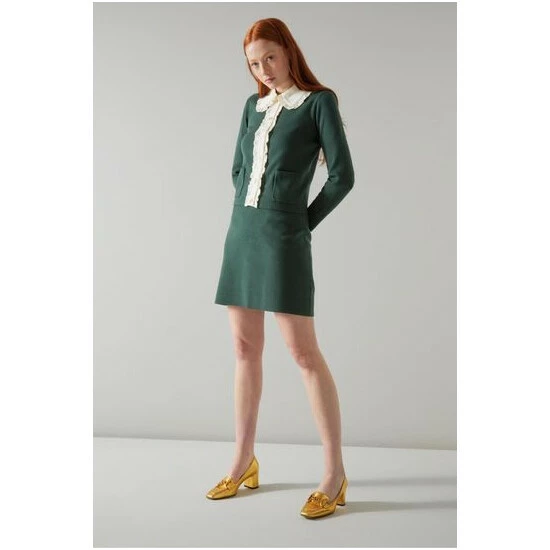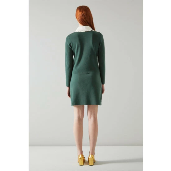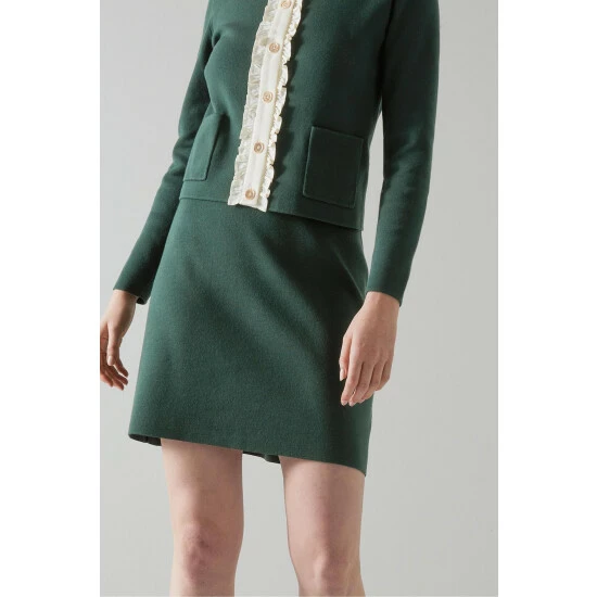 The Paris skirt is crafted from a pine green smooth and stretchy knit. It sits on the waist, has an A-line shape and is embellished with gold-tone decorative buttons.
