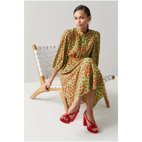 The Tamara dress is crafted from silk in a mint and red 196’s blossom print. It has a stand-up collar, pleating at the neckline, back and shoulders, puffball sleeves, a cumberband tie belt and a floaty midi skirt.