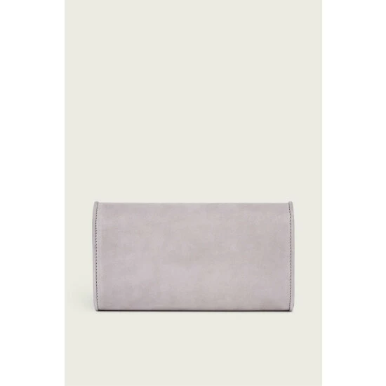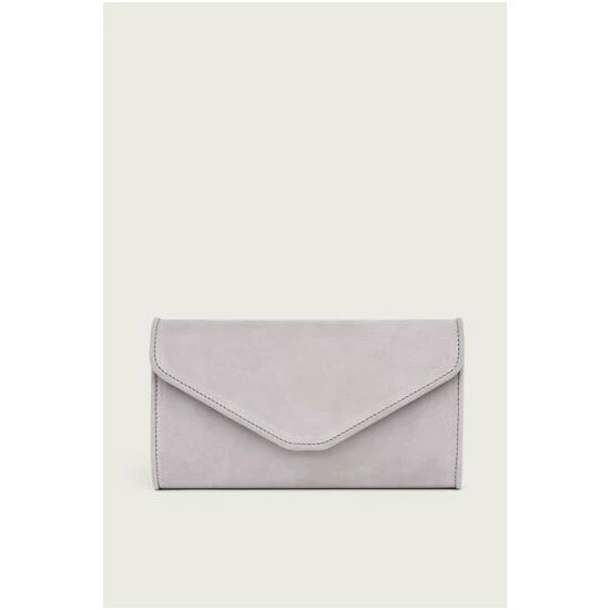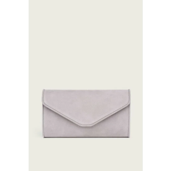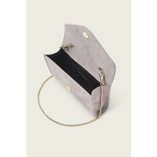 The Dominica clutch bag is crafted in Spain from pale grey suede. It’s an envelope clutch with a piped trim, it fastens with a hidden press stud, has a removable chain shoulder strap and an inside slip pocket.