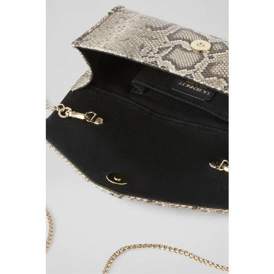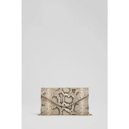 The Dominica clutch bag is crafted in Spain from natural snake-effect leather. It’s an envelope clutch with a piped trim and fastens with a hidden press stud. It has a removable chain shoulder strap and an inside slip pocket.
