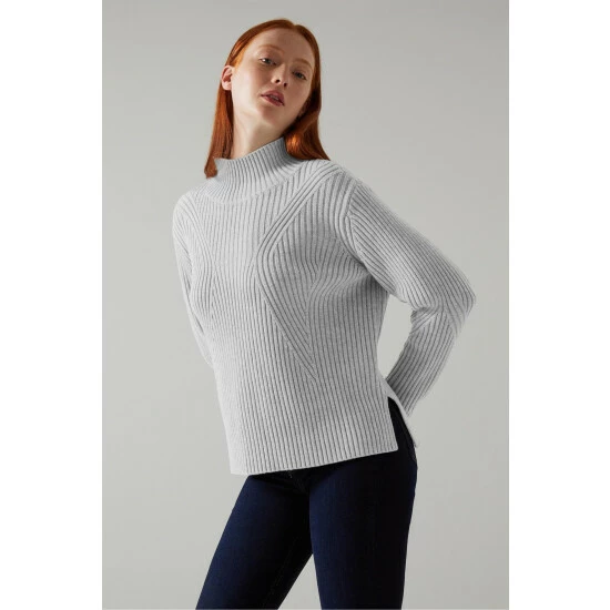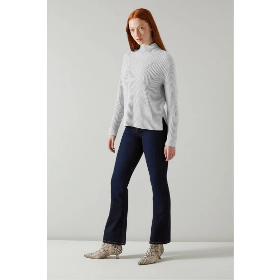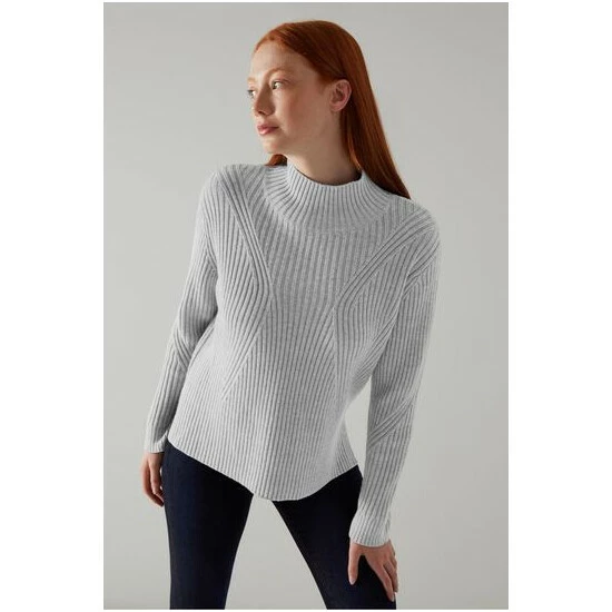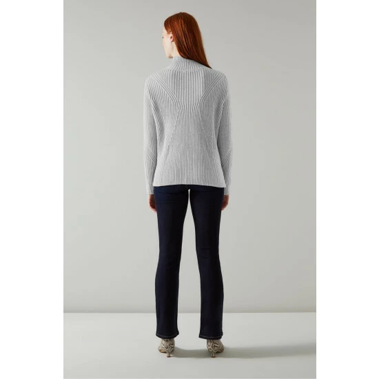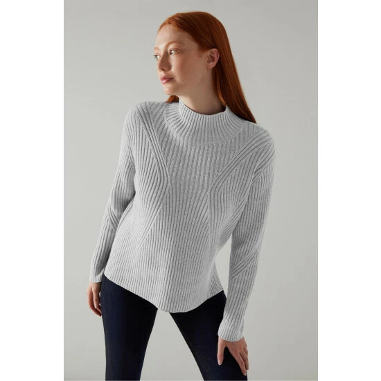 The Melody jumper is crafted from a wool-cotton blend in silver mélange. It’s a graphic ribbed style with a turtle neck, long sleeves and a relaxed long cut with side slits and a dipped hemline.