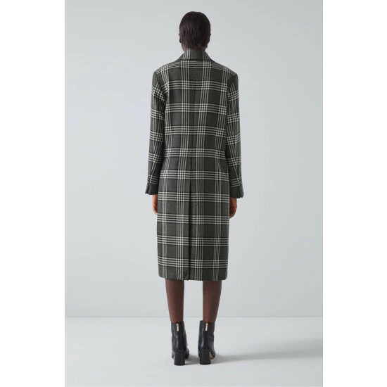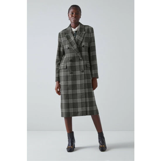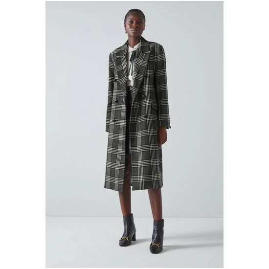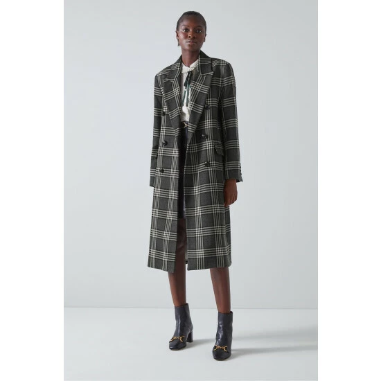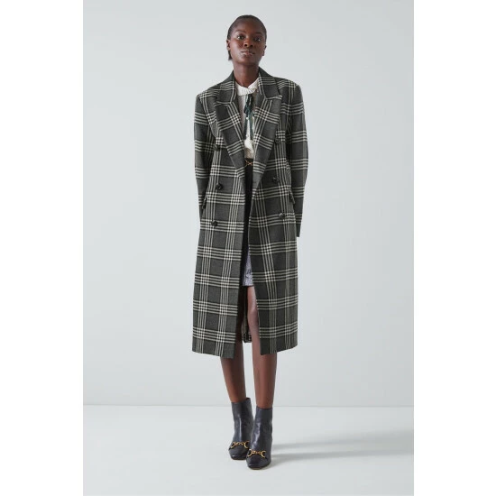 The Quentin double-breasted coat is crafted from grey and cream Prince of Wales checked Italian virgin wool. It’s a double-breasted style with a peak lapel, black buttons, flap pockets and impeccable tailoring and it falls to just below the knee.