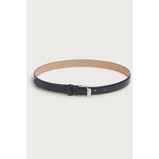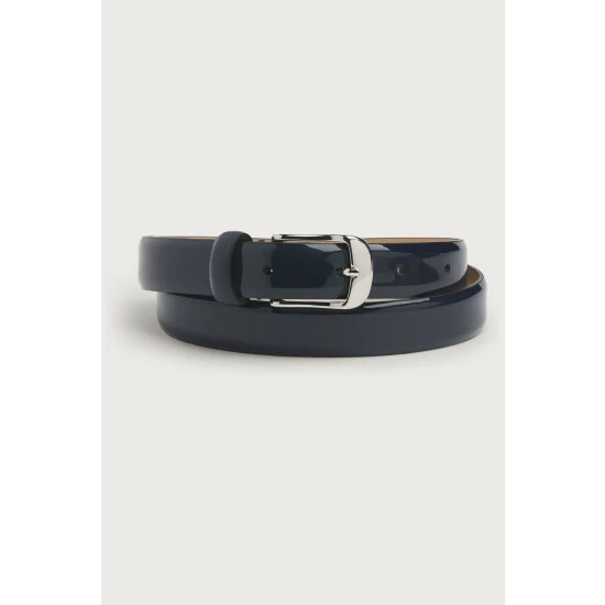 The Gunders belt is crafted in Italy from navy patent leather. It’s a slim style finished with a polished gold D-ring buckle.
