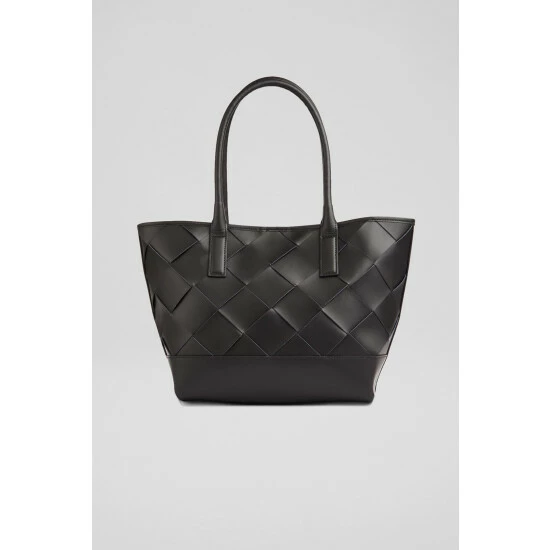 The Harper tote bag is crafted in Italy from smooth black leather in a woven design. It’s a roomy style with double handles and an inside pocket.