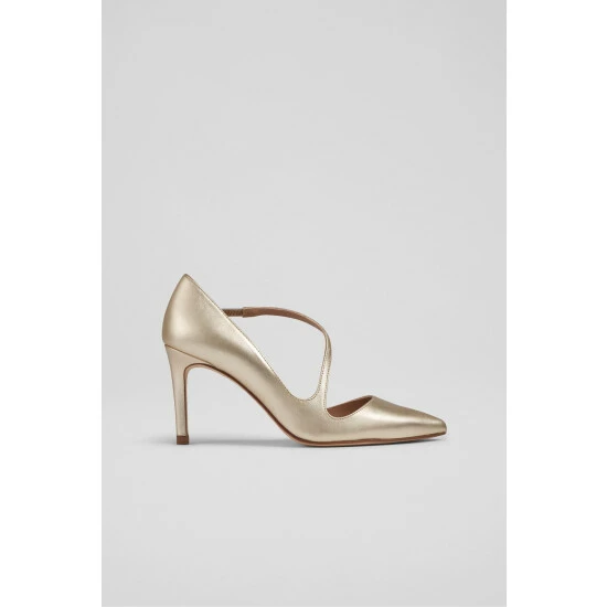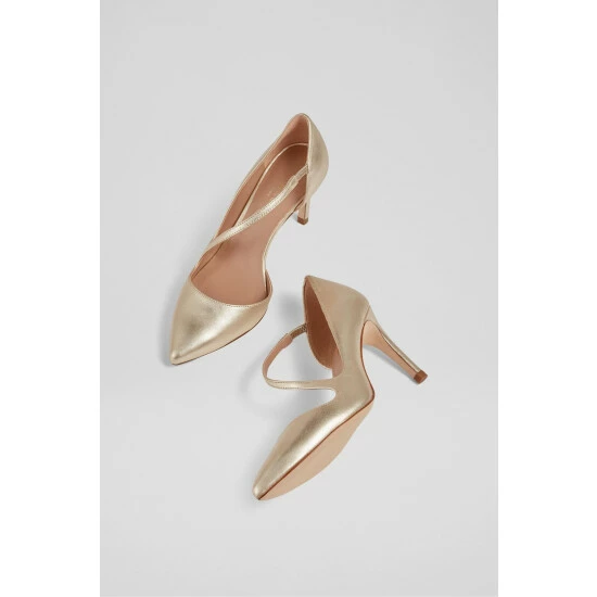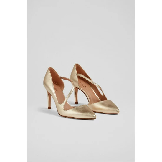 The Heather D’orsay courts are crafted in Spain from champagne-hued gold leather. They have a pointed toe, asymmetric cut-out-detail across the foot and a slender, 85mm stiletto heel.