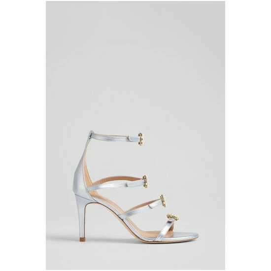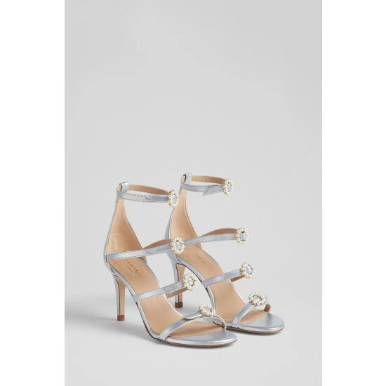 The Harper sandals are crafted in Spain from ice blue metallic leather. They are an open-toe style with multiple straps over the foot and around the ankle finished with pearl buckles, and they stand on an 80mm stiletto heel.