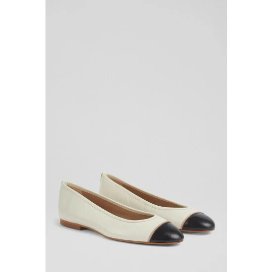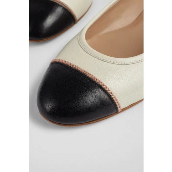 The Isabella pumps are crafted in Spain from white nappa leather. They have a round black toe cap with pink plaited trim, a sleek, simple silhouette and a small flat heel.