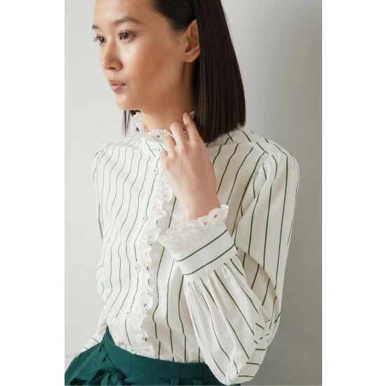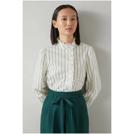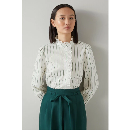 The Jackson blouse is crafted from white and green striped cotton. It has a funnel neck collar with a broderie anglaise trim which runs down the placket and around the cuffs, and it has long sleeves, a pleated back yoke and a regular fit.