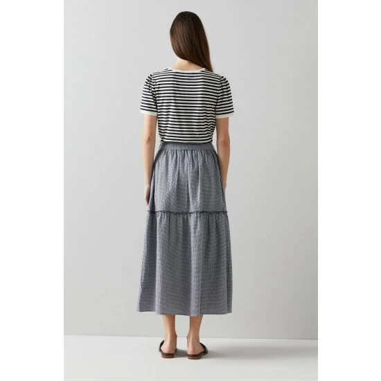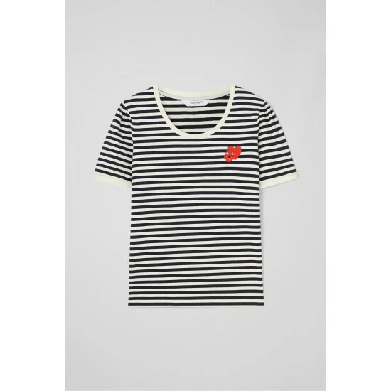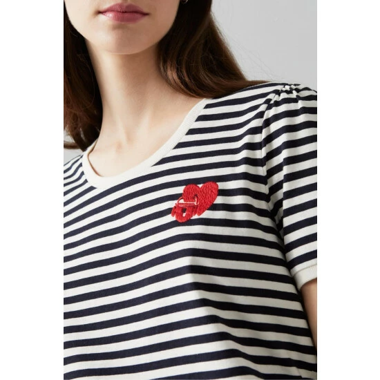The Jade T-shirt is crafted in Portugal from a stretch cotton in navy and cream stripes. It has a round neck and short sleeves with a white trim, a red embroidered lock and heart motif, and a regular fit.