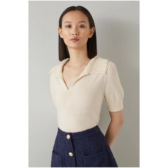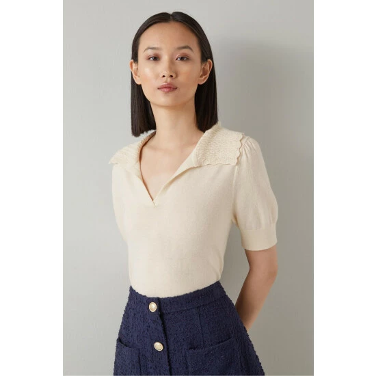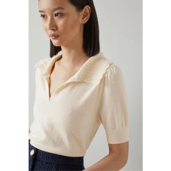 The Julie knitted top is crafted from a blend of wool and organic cotton in whipped cream. This short-sleeved style has a V-front finished with a lace collar, puff shoulders and a regular fit.