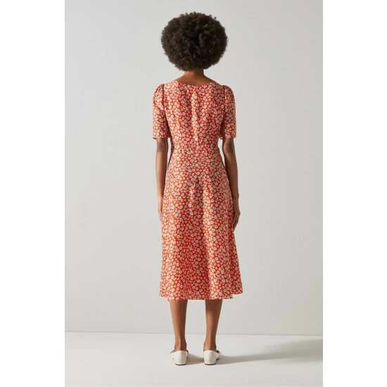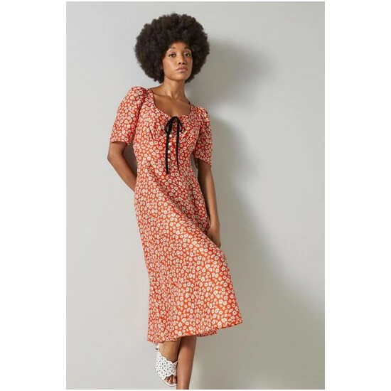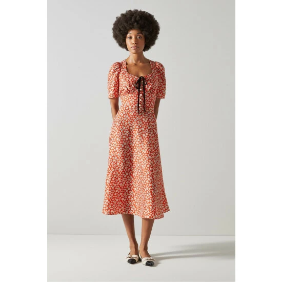 The Julien dress is crafted from a tomato red silk with a 1960’s daisy print, reimagined from vintage archives. It has puffed shoulders, a nipped in waist and floaty hem.