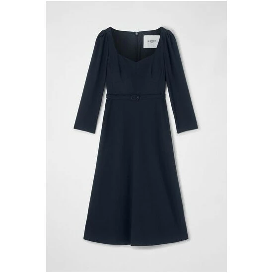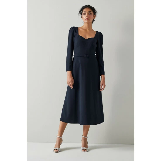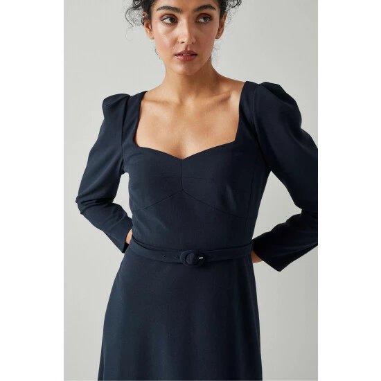 The Katerina dress is crafted from navy blue crepe. It has a sweetheart neckline, puff shoulders, bracelet-length sleeves, a nipped waist with a buckle belt and a midi skirt.
