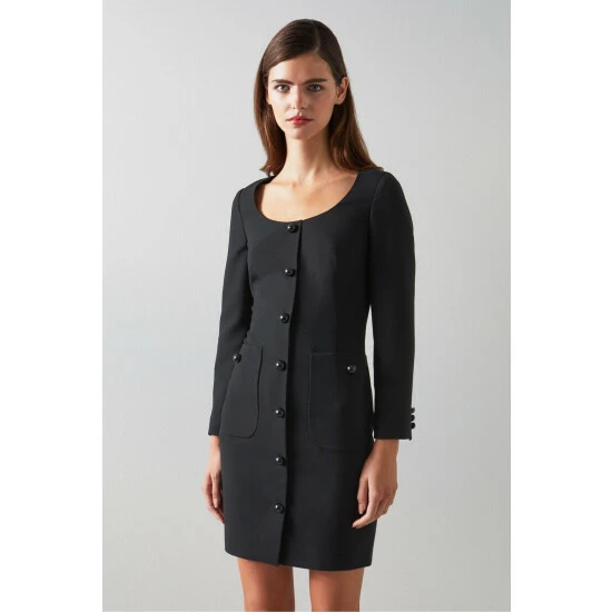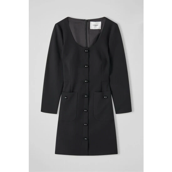 The Keeler dress is crafted in Europe from a black crepe made from a blend of fabrics including recycled polyester. It has a deep scoop neck, long sleeves, fully-functioning black dome buttons, a fitted silhouette and it falls to just below the knee.