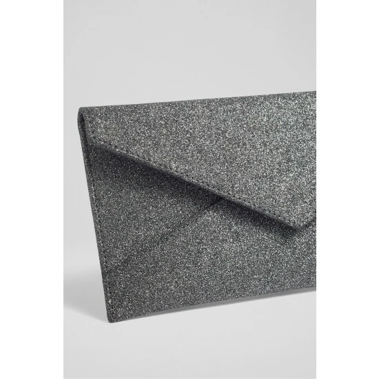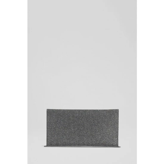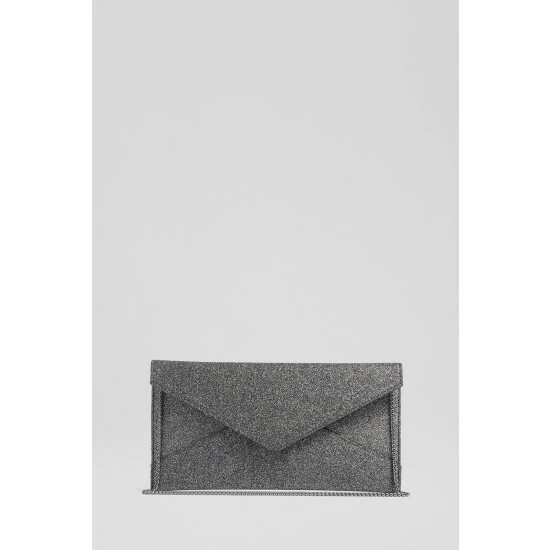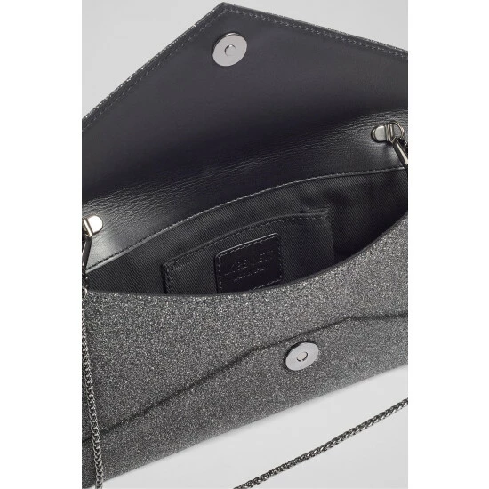 The Kendall envelope clutch bag is crafted in Spain from black glitter fabric. It’s a slim, rectangular shape with a press stud fastening, a removable chain shoulder strap and an inside zip pocket.