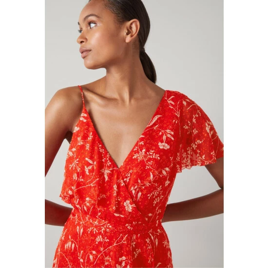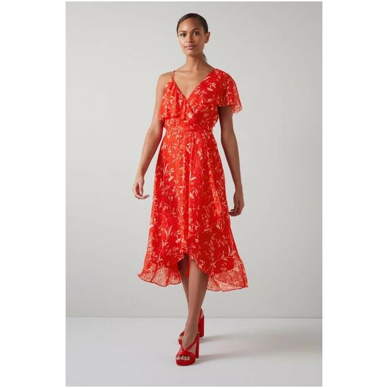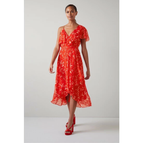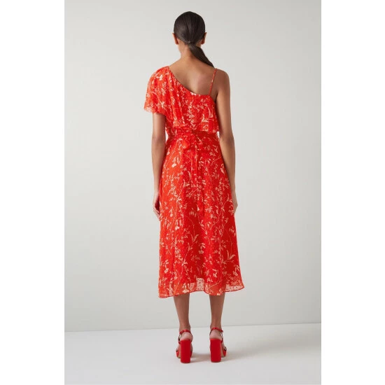 The Krasner dress is crafted from a silk-blend devoré fabric in a vintage archive botanical print in red and cream. It’s a V-neck, asymmetric style with a cape sleeve on one side and a single shoulder strap on the other. It has a ruffle trim across the front and back, a tie belt and a crossover midi skirt with ruffle trim and dipped back.