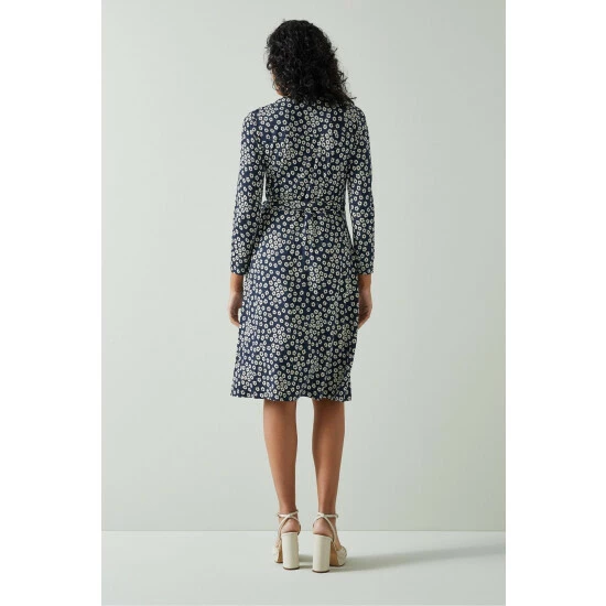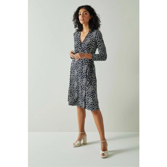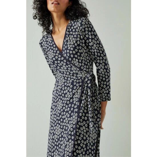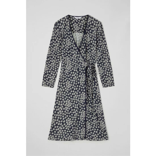 The Audrey wrap dress is crafted in Portugal from jersey in a navy and cream daisy print. It has a wrapover front which fastens with a tie to the waist, three-quarter sleeves and it falls to the knee.